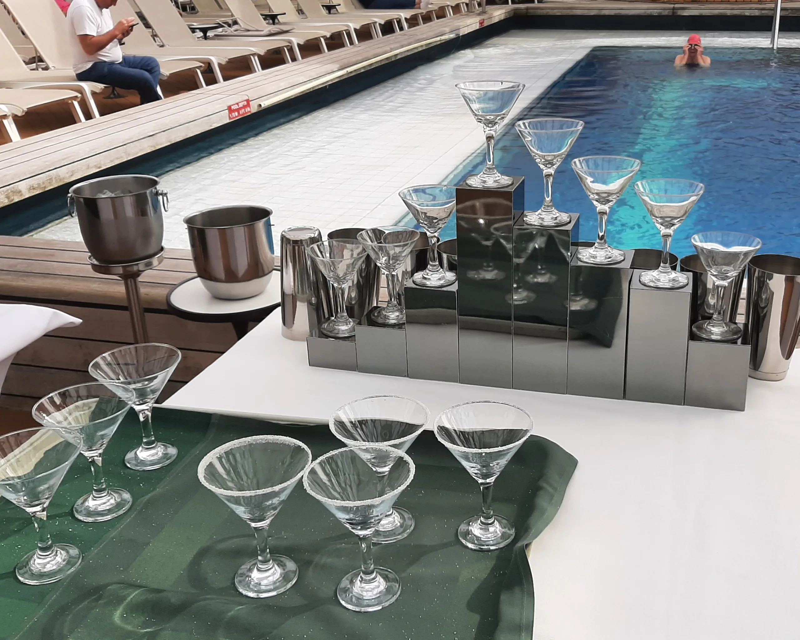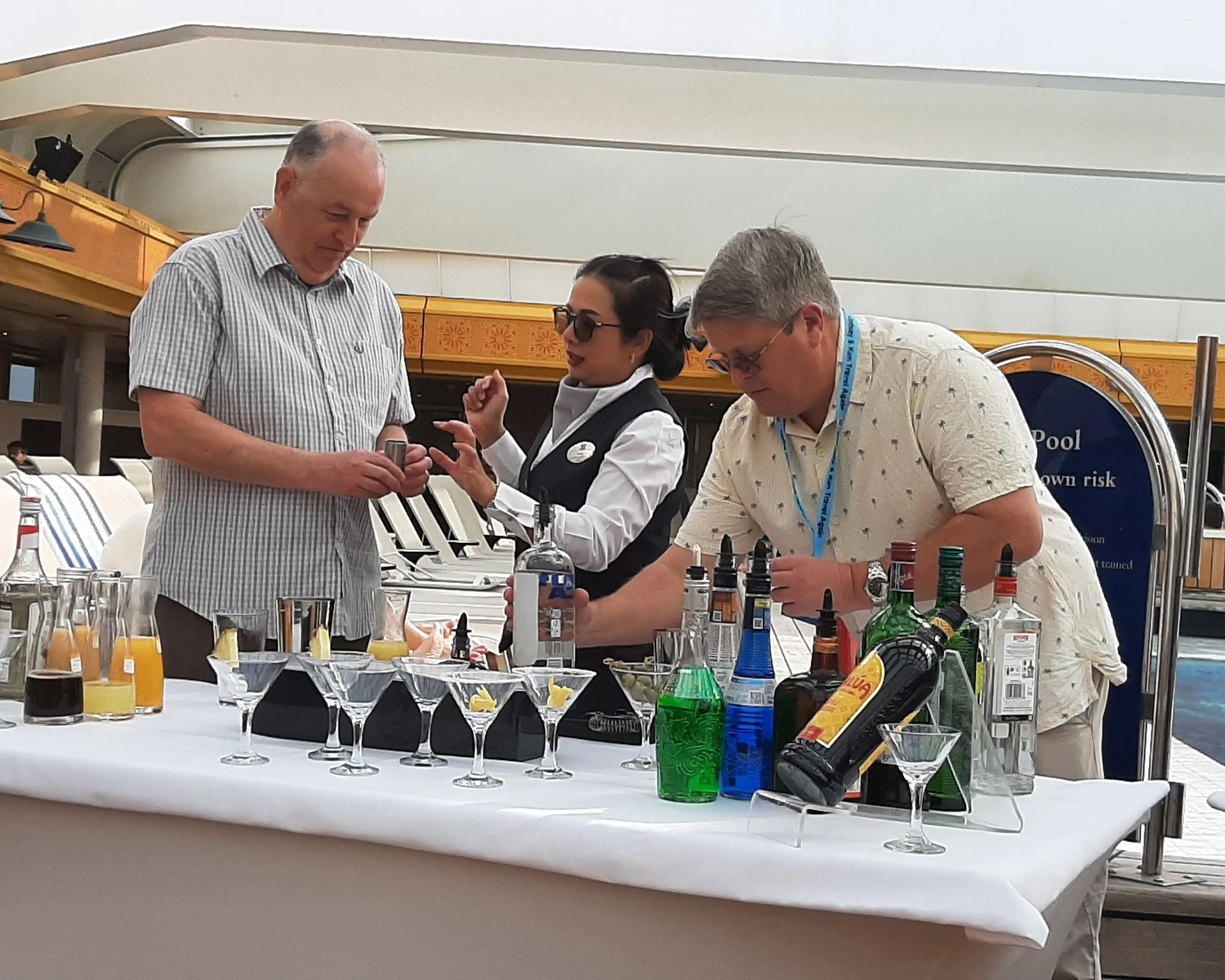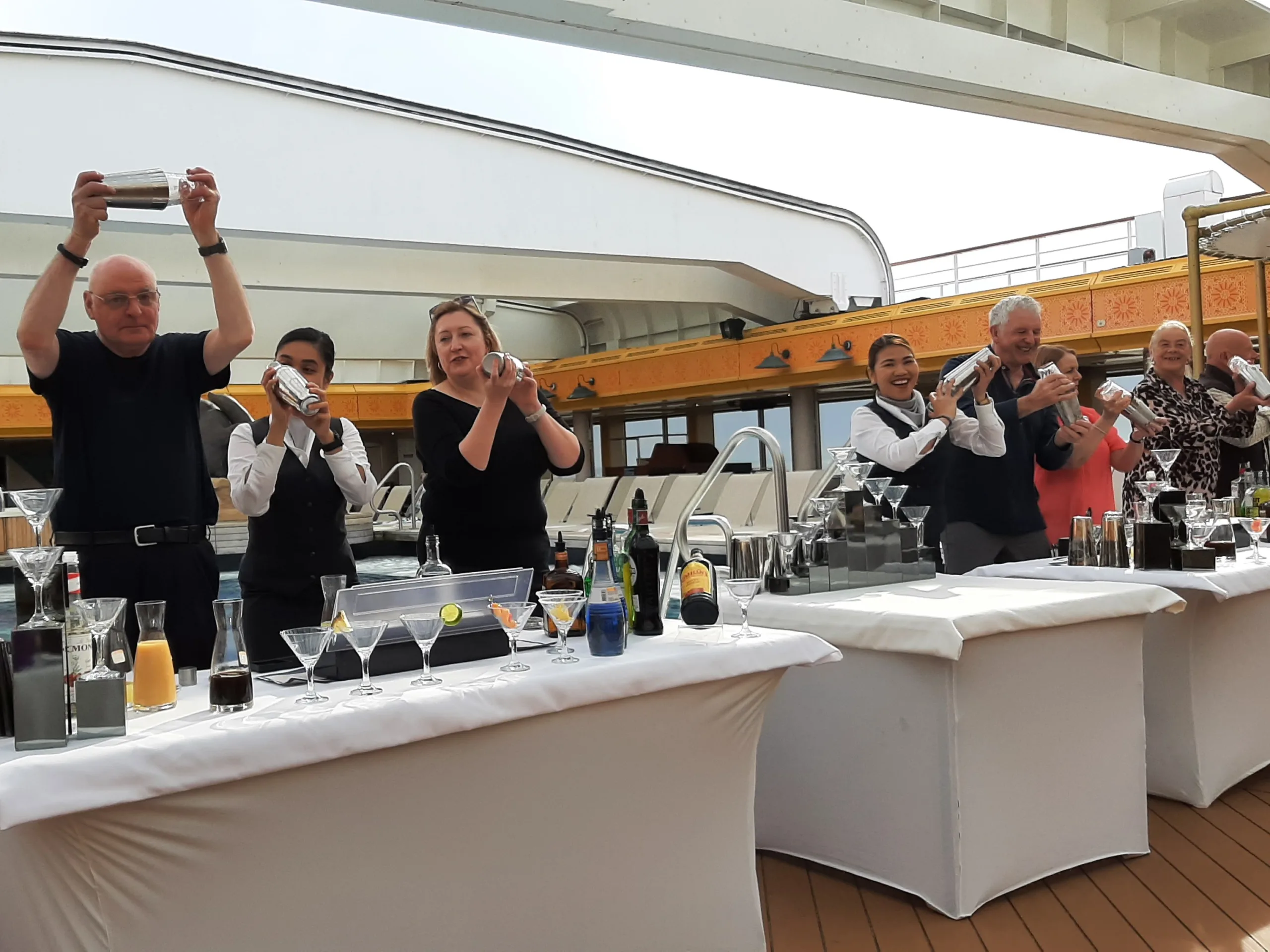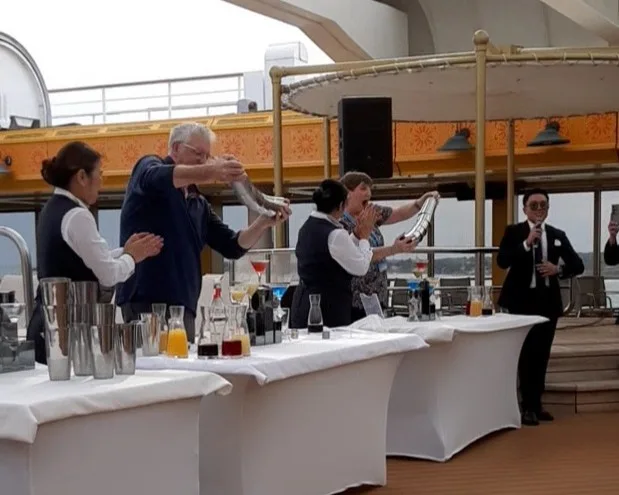 Bar staff performed several Flair demonstrations for us. This is a real talent and not particularly easy to do whilst at sea! We also had a demonstration of pouring multiple Martinis at one time. This is a skill that needs a steady hand and a certain amount of strength.
