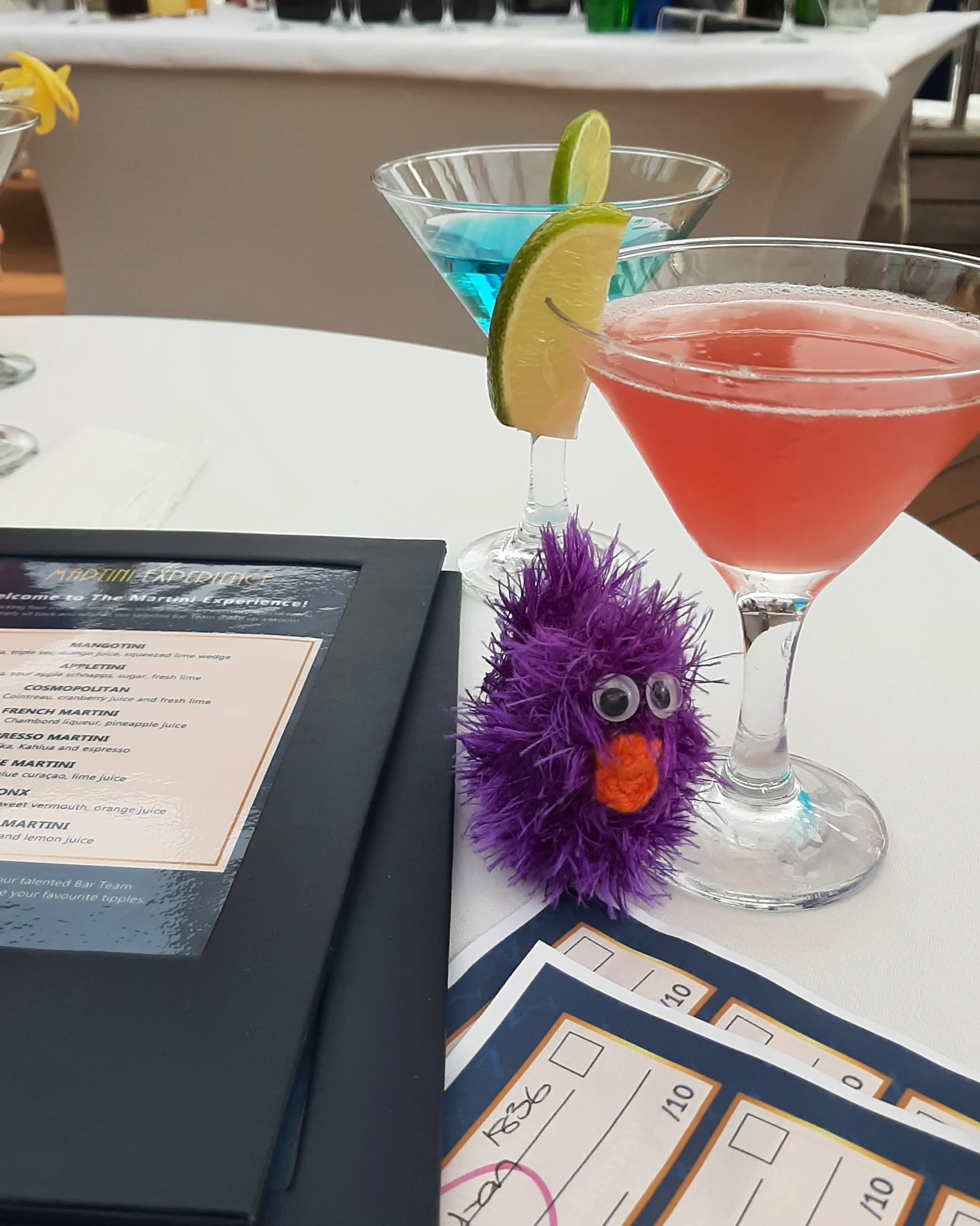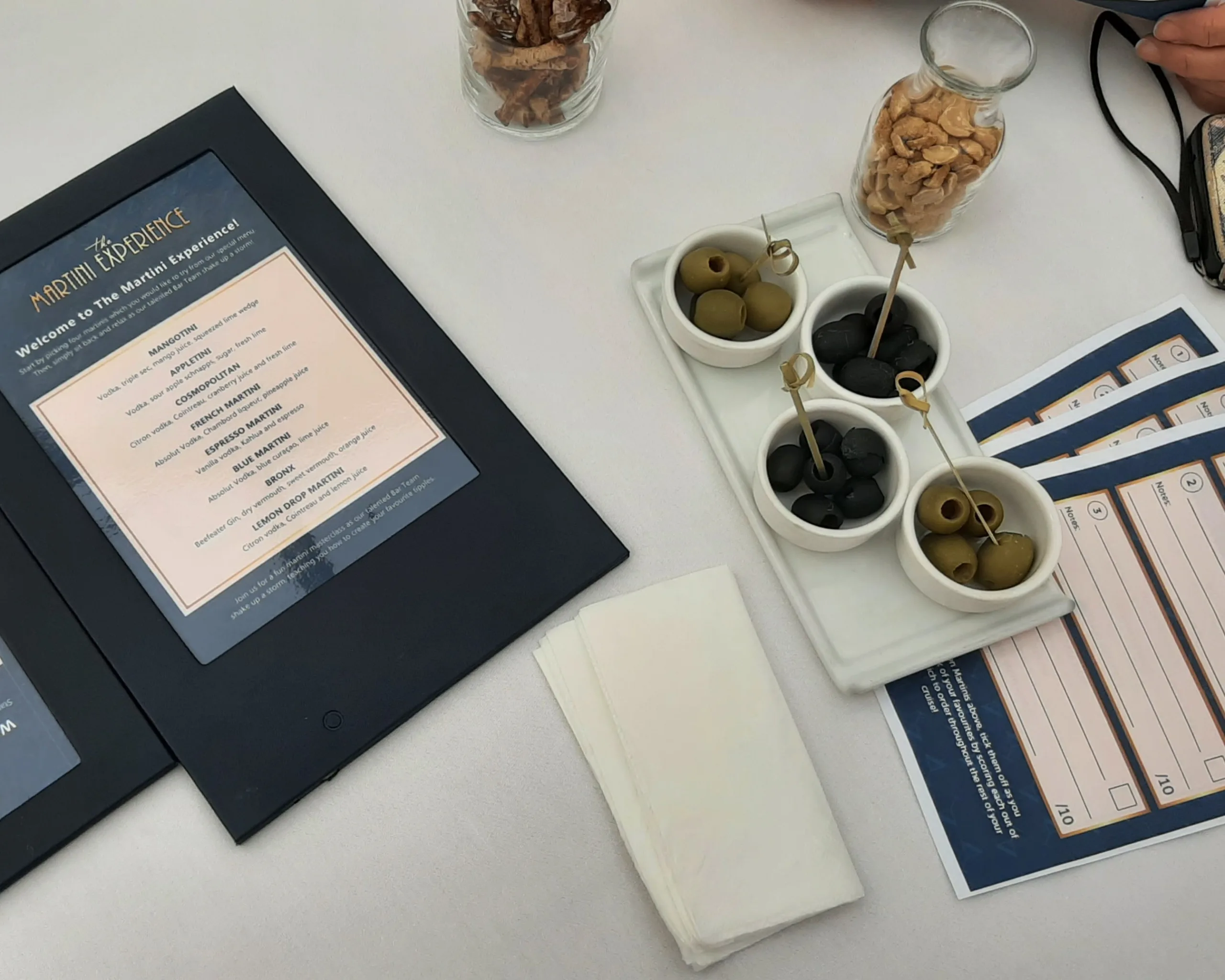 We were welcomed by the ever-enthusiastic and friendly Bar Staff and invited to take seats. The tables were laid out with snacks and the all important list of Martinis available. These were Mangotini, Appletini, Cosmopolitan, French Martini, Expresso Martini, Blue Martini, Bronx and Lemon Drop Martini. Then came the most taxing part of the experience – choosing just 4 to drink!