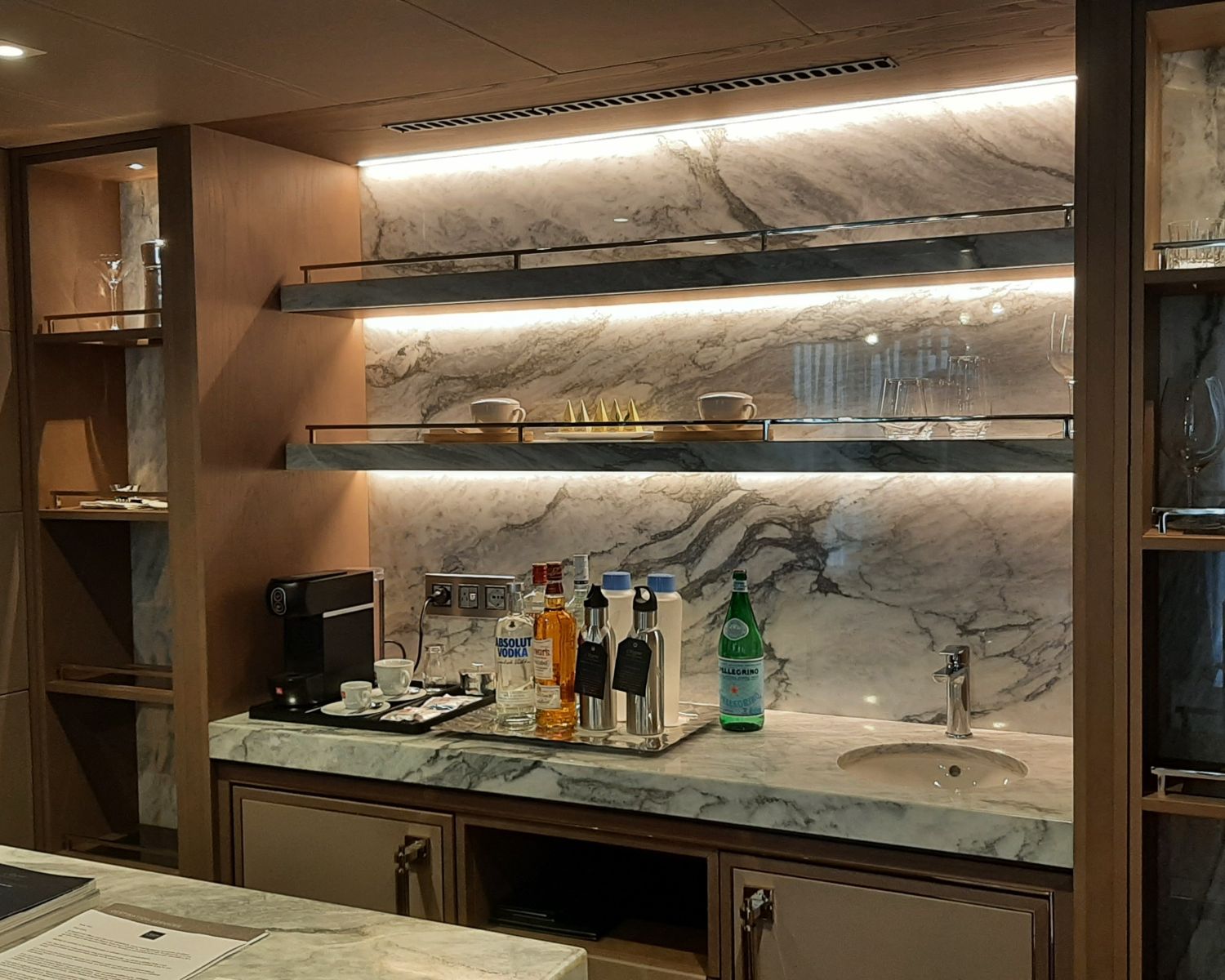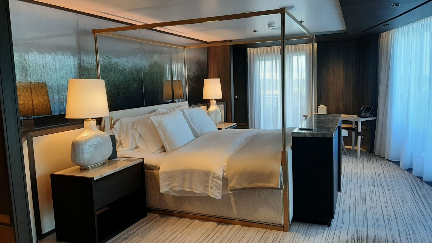 There’s nothing like starting at the top – and here it is, The Regent Suite. One of a kind and probably the most expensive Suite at Sea. It is 472.7 sq/m (the balcony alone is 120 sq/m). The suite has two bedrooms – a master bedroom and a guest bedroom. Each of course have their own en suite facilities and walk-in wardrobes. On top of that there is the living accommodation, an in-suite spa retreat with sauna steam room and jacuzzi, fitness area, private balcony and a Treesse Minipool. There is 24-hour in suite dining, valet laundry, access to The Study private dining room for up to 12 guests, personalised in-suite mini-bar and Butler services.